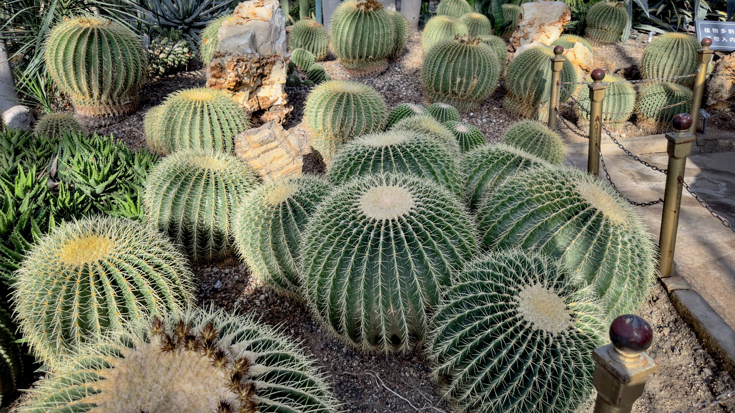 穿过基本温室之后,就来到沙漠植物区域,这片区域内的温度更高。穿着毛衣的我,在里面呆了不到三分钟,我浑身就已经湿透。周遭奇形怪状的植物对我也完全丧失吸引力,我一边催促恭王前进,一边走马观花地观看着热带植物。当然,在面对圆滚滚的炸毛西瓜(金桶仙人掌)时,我还是驻足观看了许久。