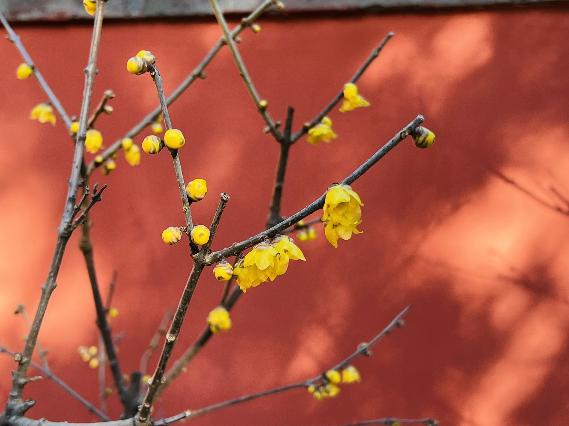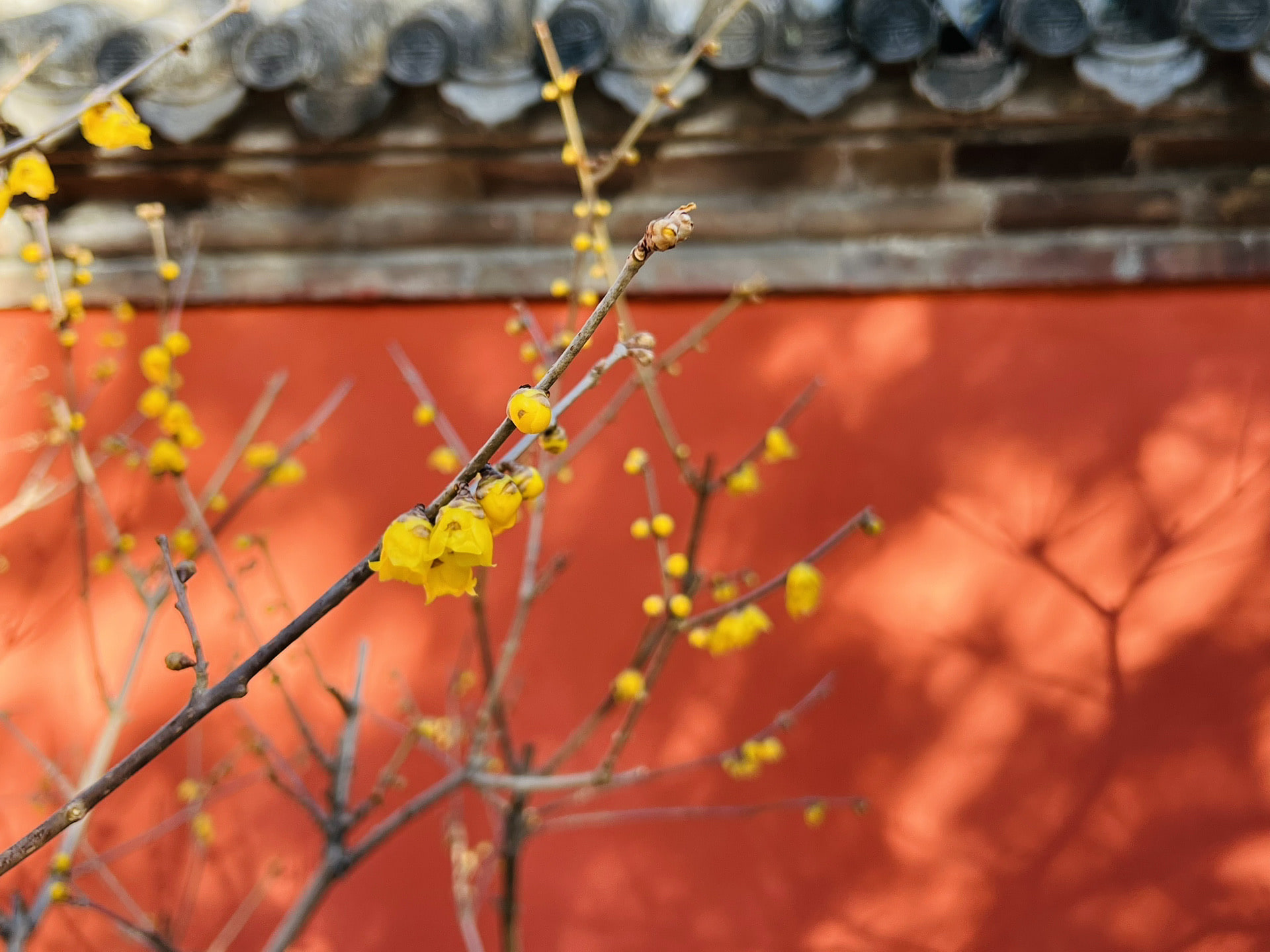 出了温室,往植物园深处走就可以抵达卧佛寺,寺院也是单独收费,但其中人声鼎沸,一进大门,就能看到人比黄花多的景象。人们长枪短炮地对着已经快至凋谢的多棵腊梅树,遥远地看上去几乎不太能分辨是否仍有花开,然而,庭院中仍有暗香涌流,如奔涛袭浪,拥人进香甜清雅的味道里。当然,我也适时地被民科专家恭王科普了「腊梅不是梅」所以不会种在「倚梅园」的道理。